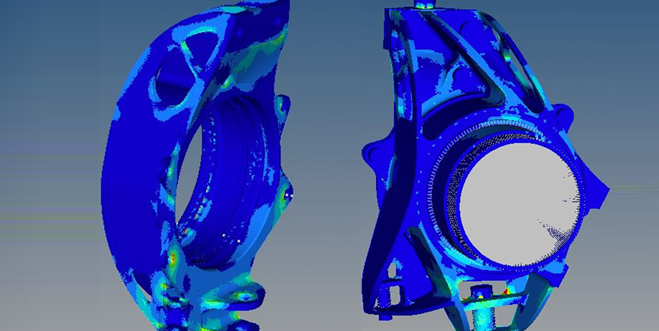 https://dhbw-engineering.de erfolgte als additiv gefertigter Bauteile. Durch die Form die aus einer Topologieoptimiertung resultiert und keine Rücksicht auf die Fräsbarkeit nehmen musste, wurde ein Gewicht von 530 Gramm vorne und 460 Gramm hinten realisiert. Die Rohteile wurden von Protolaps aus AL-Si10Mg gefertigt. Additiv gefertigte Bauteile können aber natürlich auch von uns bezogen werden. Durch die Fertigung aller wichtigen Merkmale in einer Aufspannung konnten die sehr kleinen Toleranzen für die Radlager und die Aufnahme des Planetengetriebes realisiert werden. Dafür war jedoch eine aufwendige Vorrichtung je Radträger notwendig um die Rohteile aufnehmen zu können.